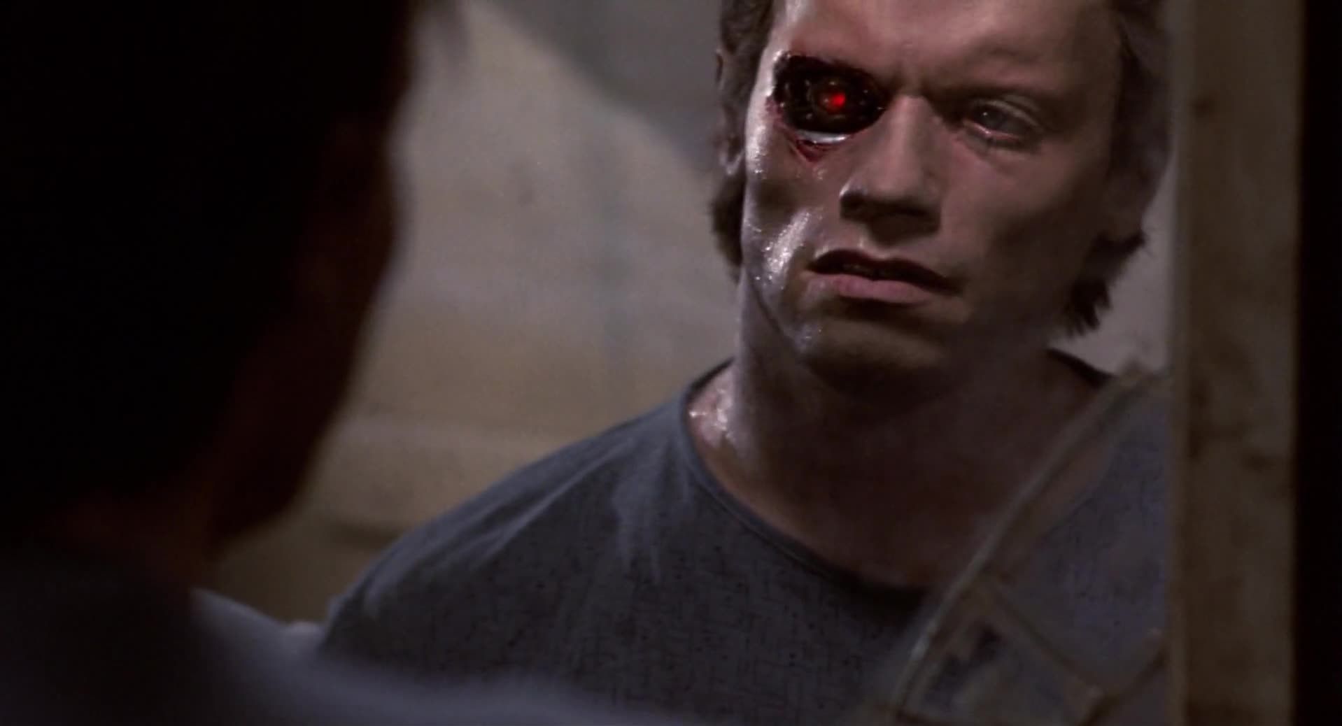 Paralelamente, hay un proceso de progresiva humanización del Terminator, expuesto al entorno humano en su viaje al pasado: el humor involuntario de la frase “Volveré” o los momentos ante el espejo del baño reflejan esa paulatina transformación, que culmina, paradójicamente, cuando el Terminator pierde al final su revestimiento humano. Es entonces cuando más humano parece, porque está herido, cojea y es vulnerable. De hecho, su final, sin ser la muerte de Roy (Rutger Hauer), el replicante de Blade Runner, es a ojos del espectador algo a caballo entre la muerte (humana) y la destrucción (maquínica).