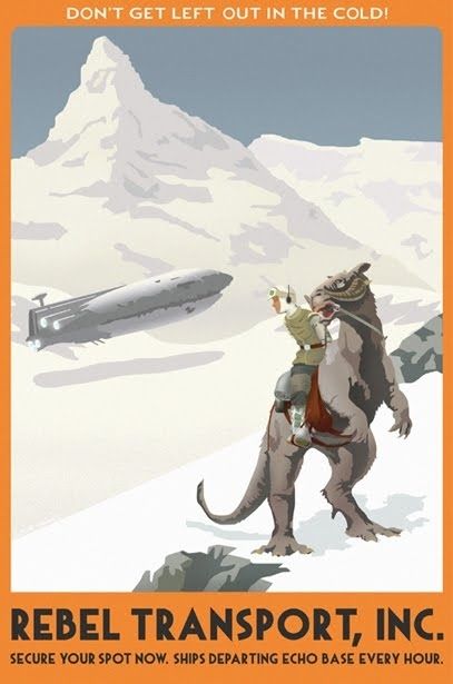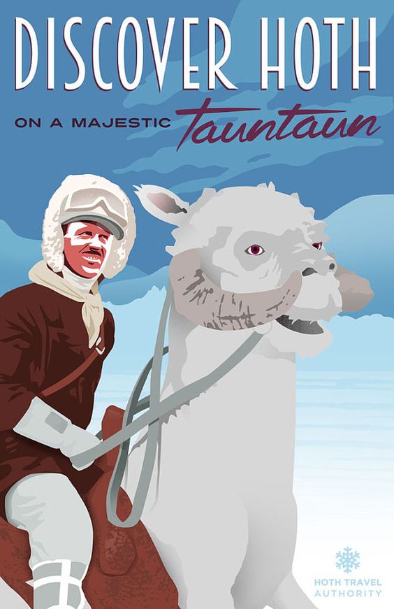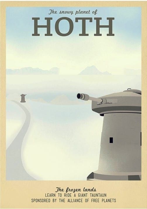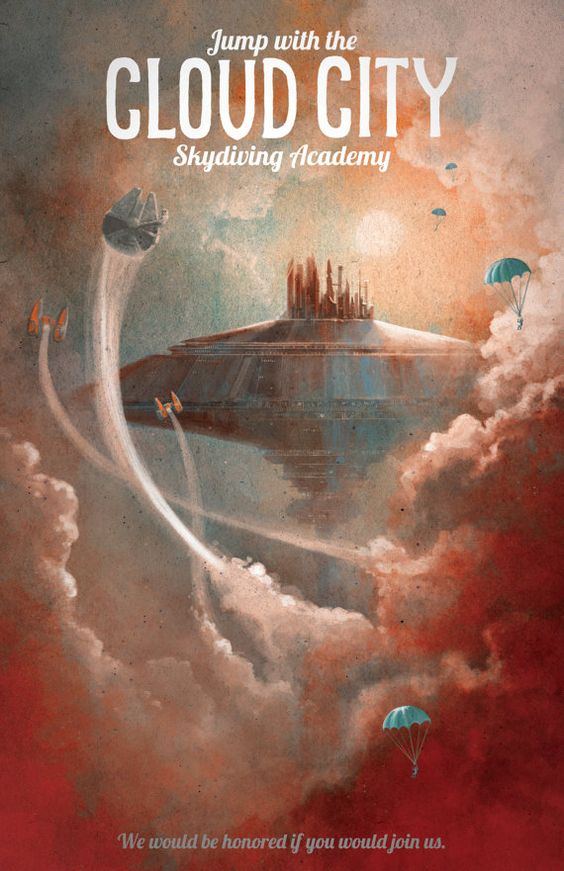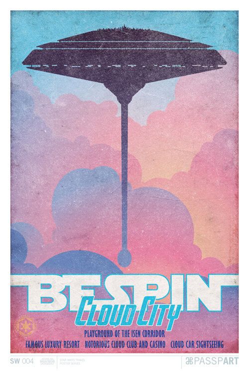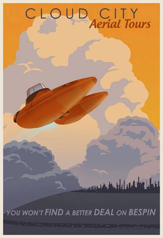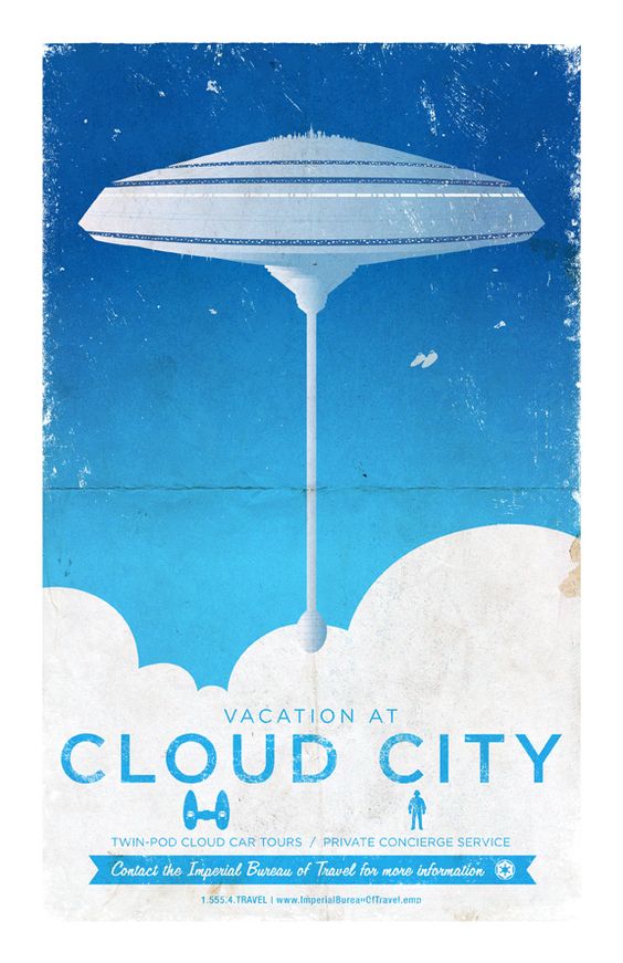 Y, para completar el repaso, una curiosa (y muy extendida) tendencia: la de crear pósters sobre los lugares emblemáticos, en muchos casos imitando a antiguos anuncios turísticos: La Ciudad de las nubes de Bespin