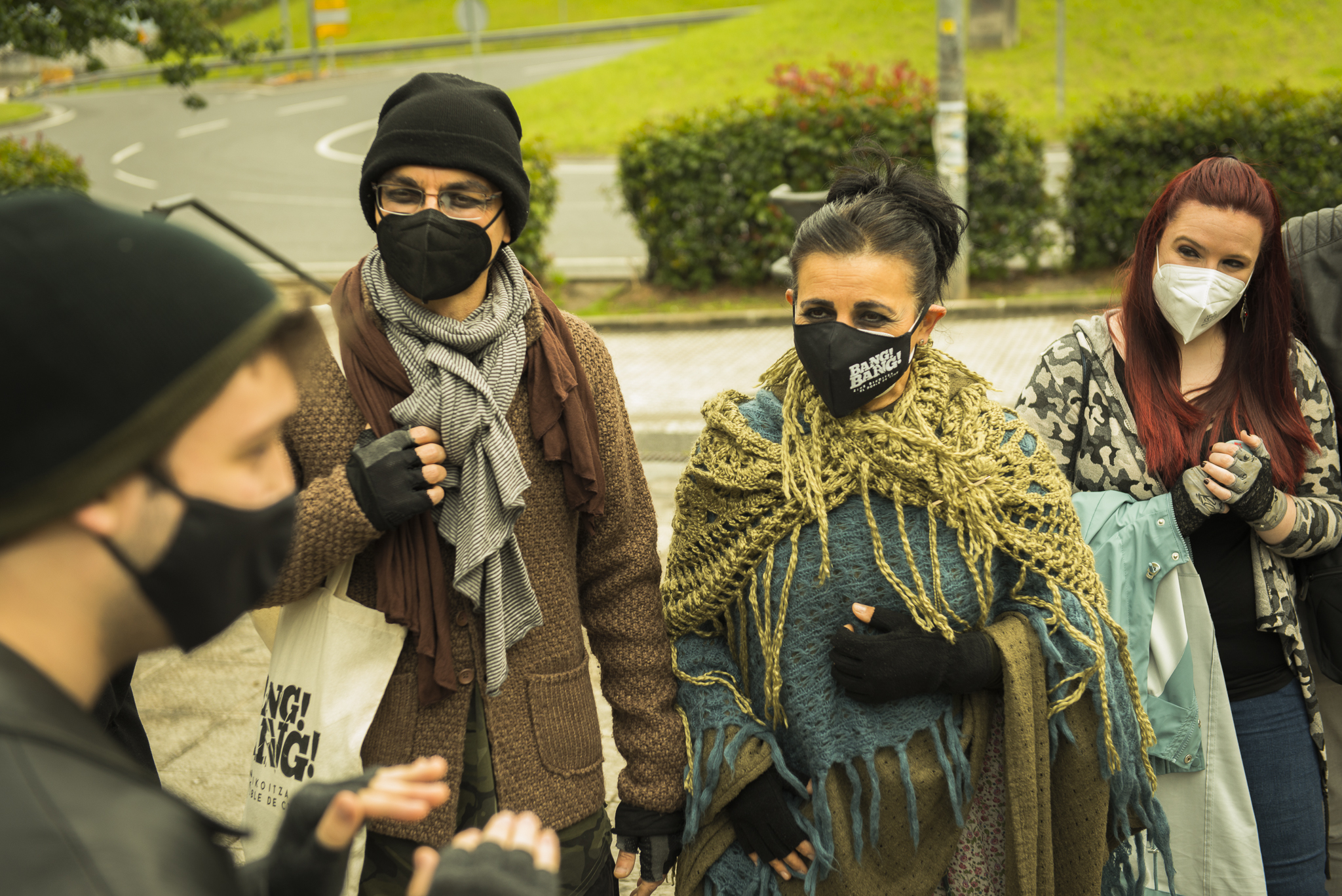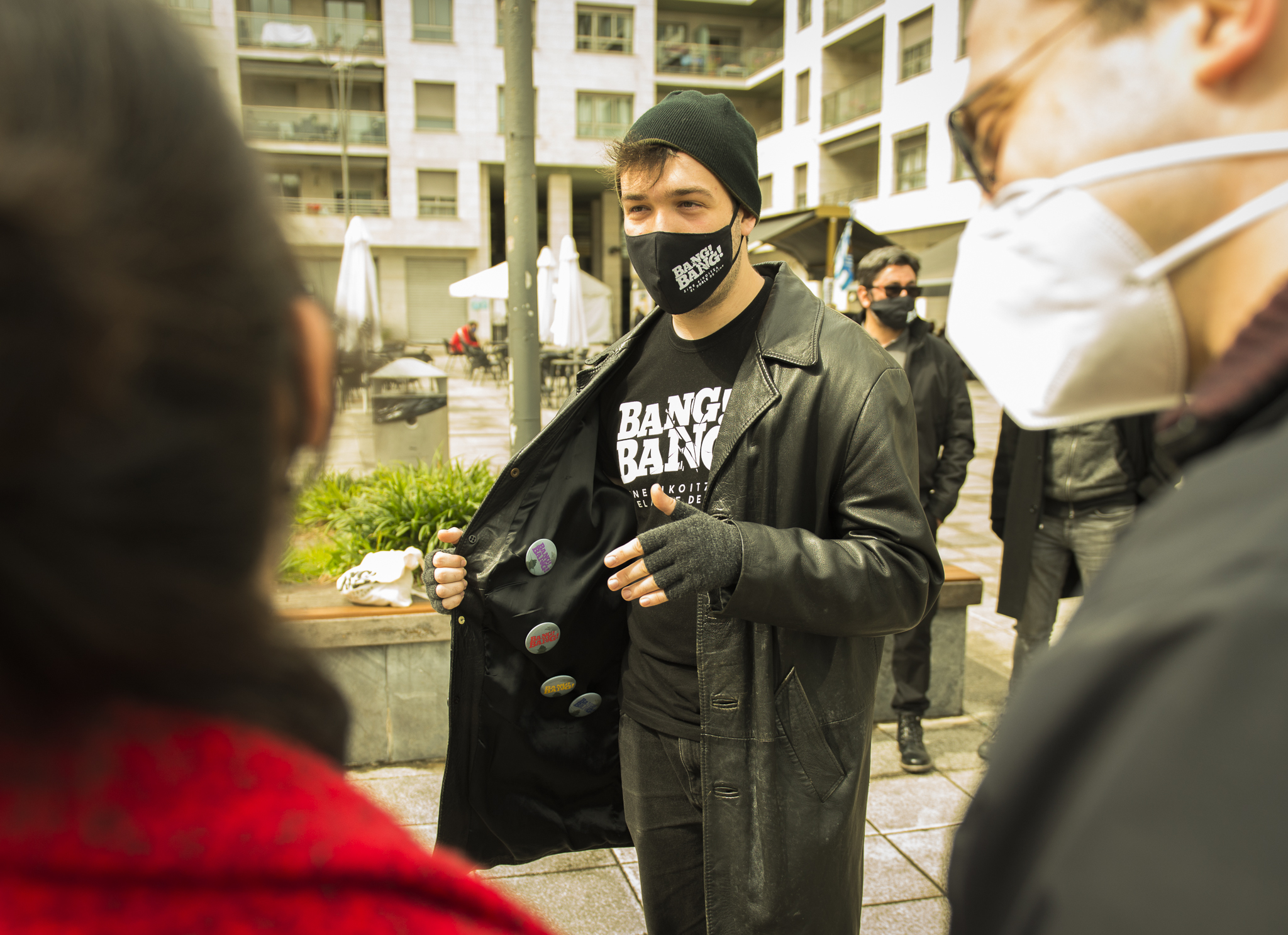 Todo comenzó en el punto de encuentro. Un lugar donde Danel, nuestro “enlace”, esperaba para dar los últimos detalles que llevarían al público hasta el lugar de la proyección. Allí, frente a la impresionante ancla situada a la entrada de Trintxerpe, y tras compartir la contraseña, todos los asistentes recibieron una chapa que los identificaba con un color y un grupo.
