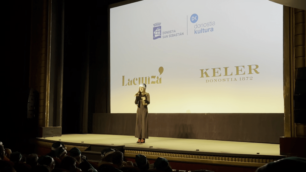 La presentación, más breve de lo habitual, estuvo dedicada sobre todo a los agradecimientos, tan propios de esta época del año: a Lacunza, a Donostia Kultura, a Keler y, sobre todo, al público que sigue apoyando en gran número y con aún mayor entusiasmo nuestras propuestas. También dimos las gracias a Casilda Romero, autora del cartel de la sesión, cuya primera colaboración fue muy aplaudida desde el patio de butacas.