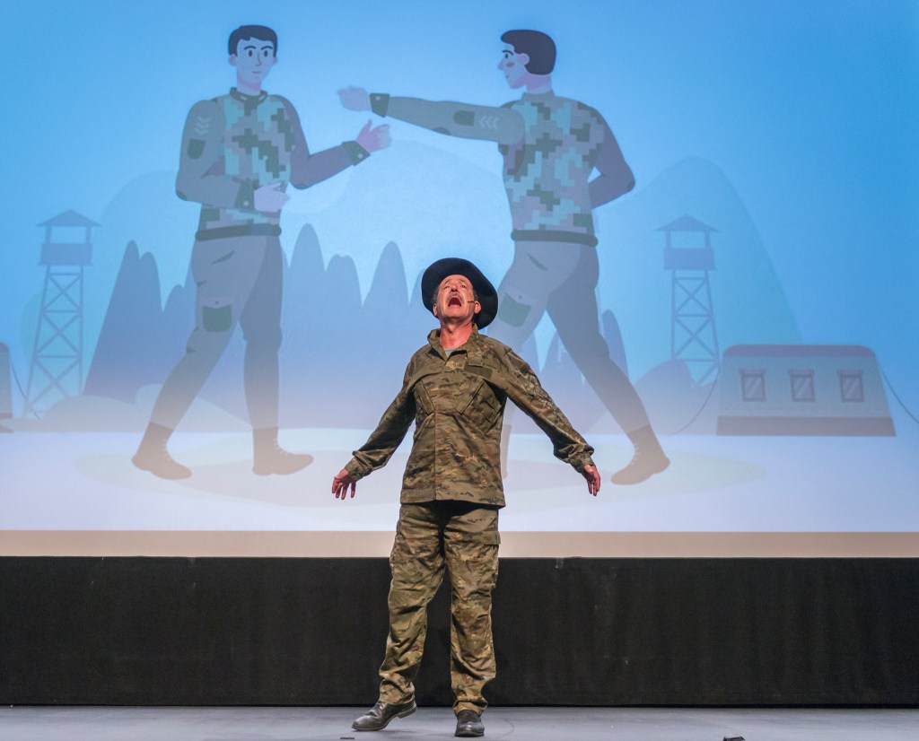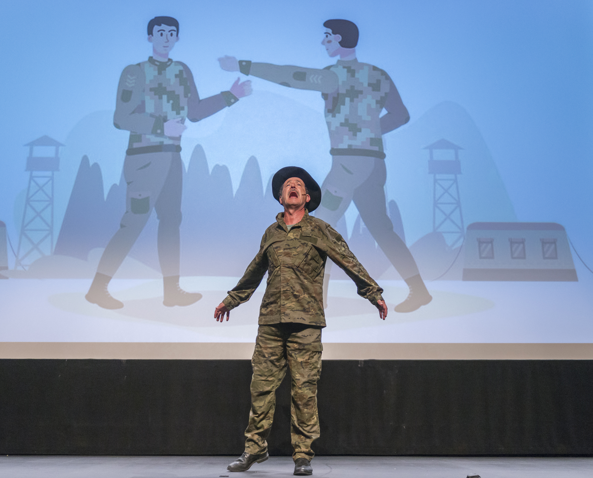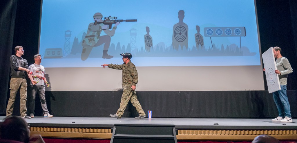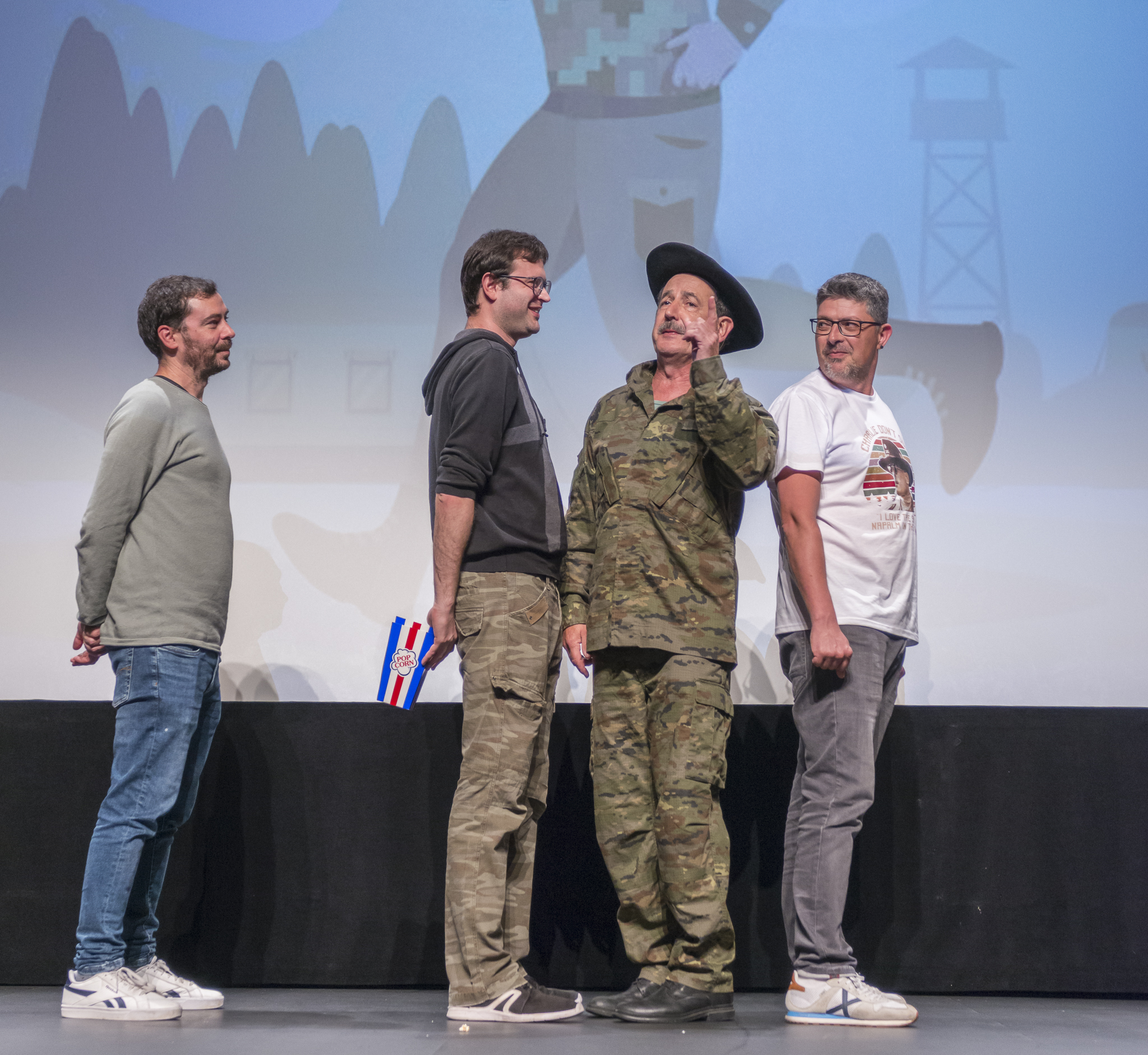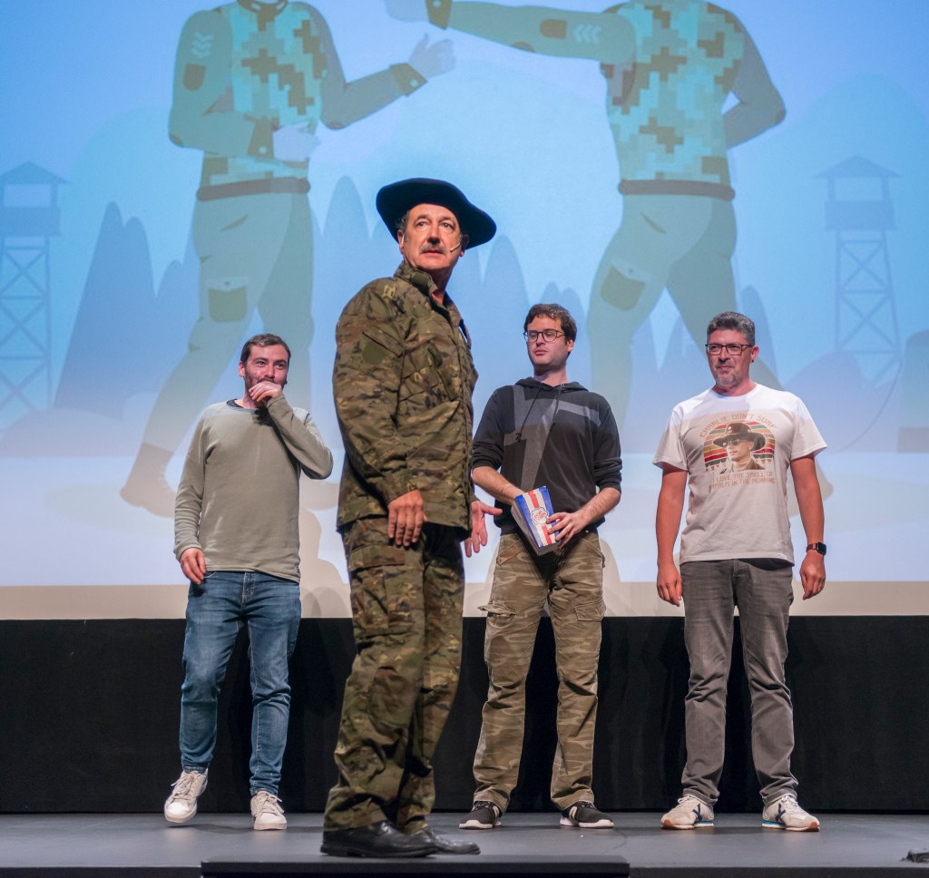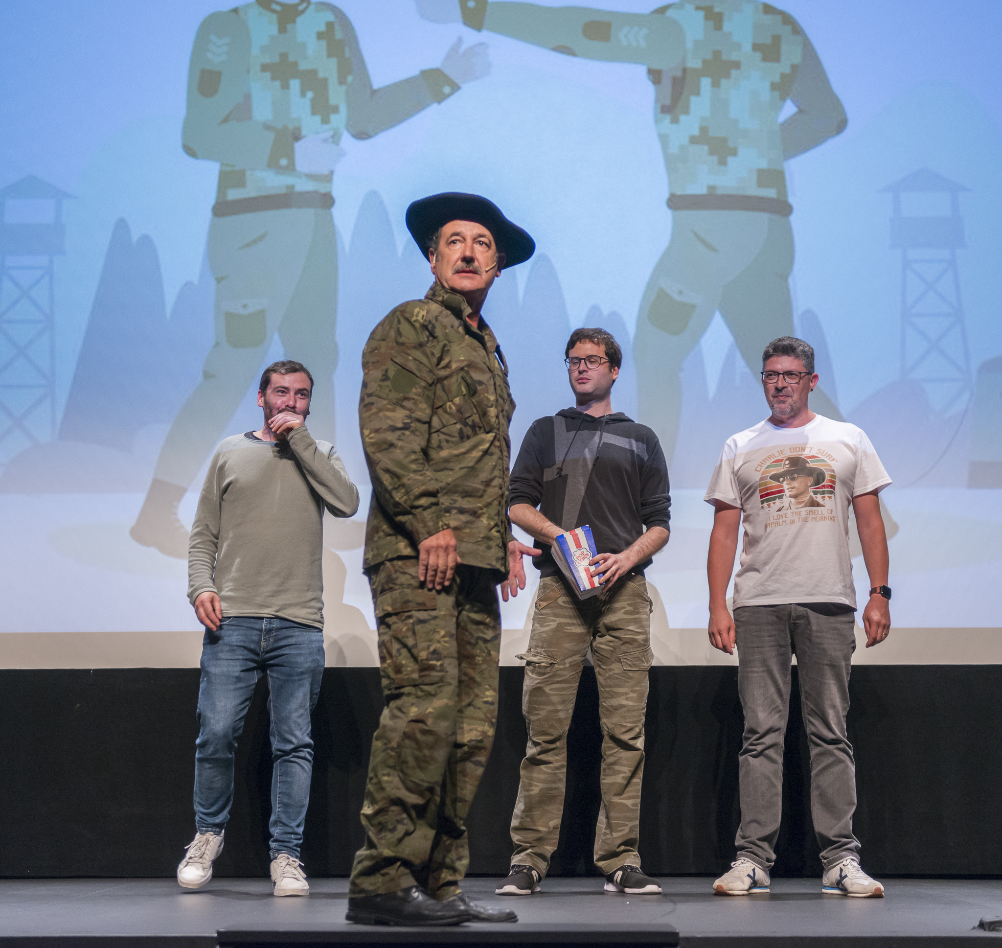 Enseguida, un Mikel Laskurain desatado irrumpió en el escenario y reclutó a tres voluntarios para intentar repeler las hordas de turistas que asaltan nuestros pintxos y nuestras playas. Tras un rato se rindió a la evidencia: con soldados de Valladolid, Gazteiz y Lezo no se puede hacer carrera, así que probó a convertirlos en espías e infiltrarlos entre el “enemigo” sin demasiado éxito. Sus habilidades con los idiomas iban parejos a su talento para la guerra.