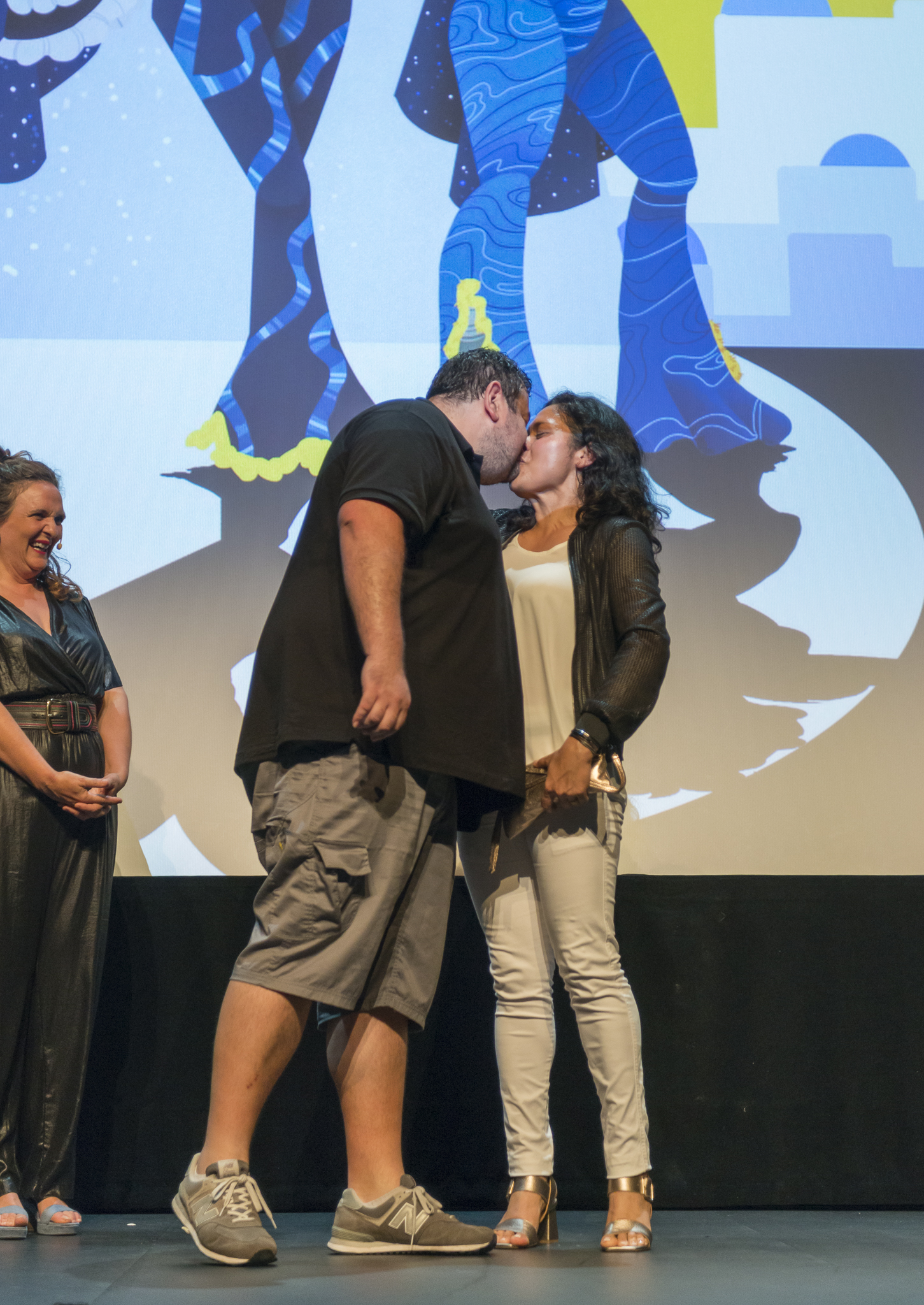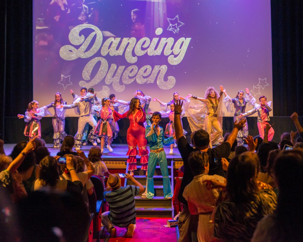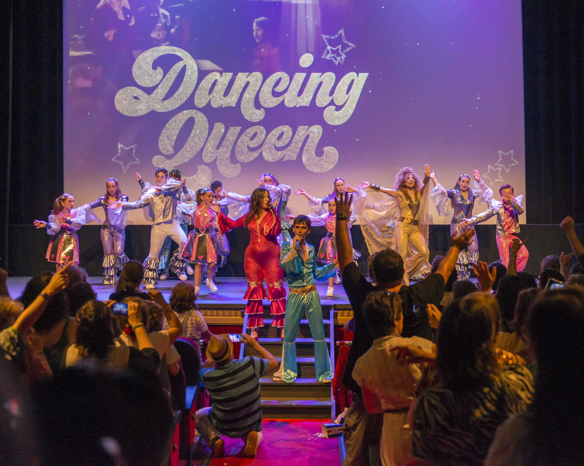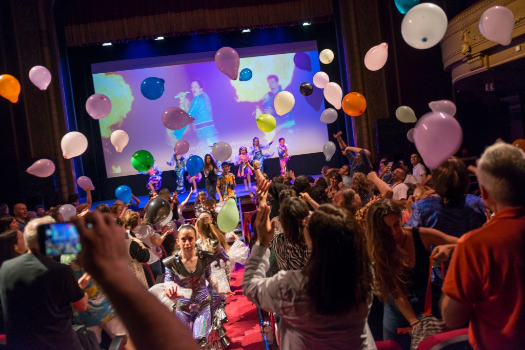 Cuando empezó la peli el público estaba a tope y el pase resultó memorable, con coros y aplausos en cada canción, hasta que llegó el final y estalló la fiesta total. Habíamos preparado una última sorpresa: durante los créditos, los bailarines de Gurea volvieron a salir acompañados de los cantantes para animar la sala repartiéndose por las dos plantas del Principal y el escenario, y bailar al ritmo de “Dancing Queen” y “Waterloo”. Y para hacerlo aún más especial, una lluvia de globos inundó el teatro. Una boda y una noche para el recuerdo.