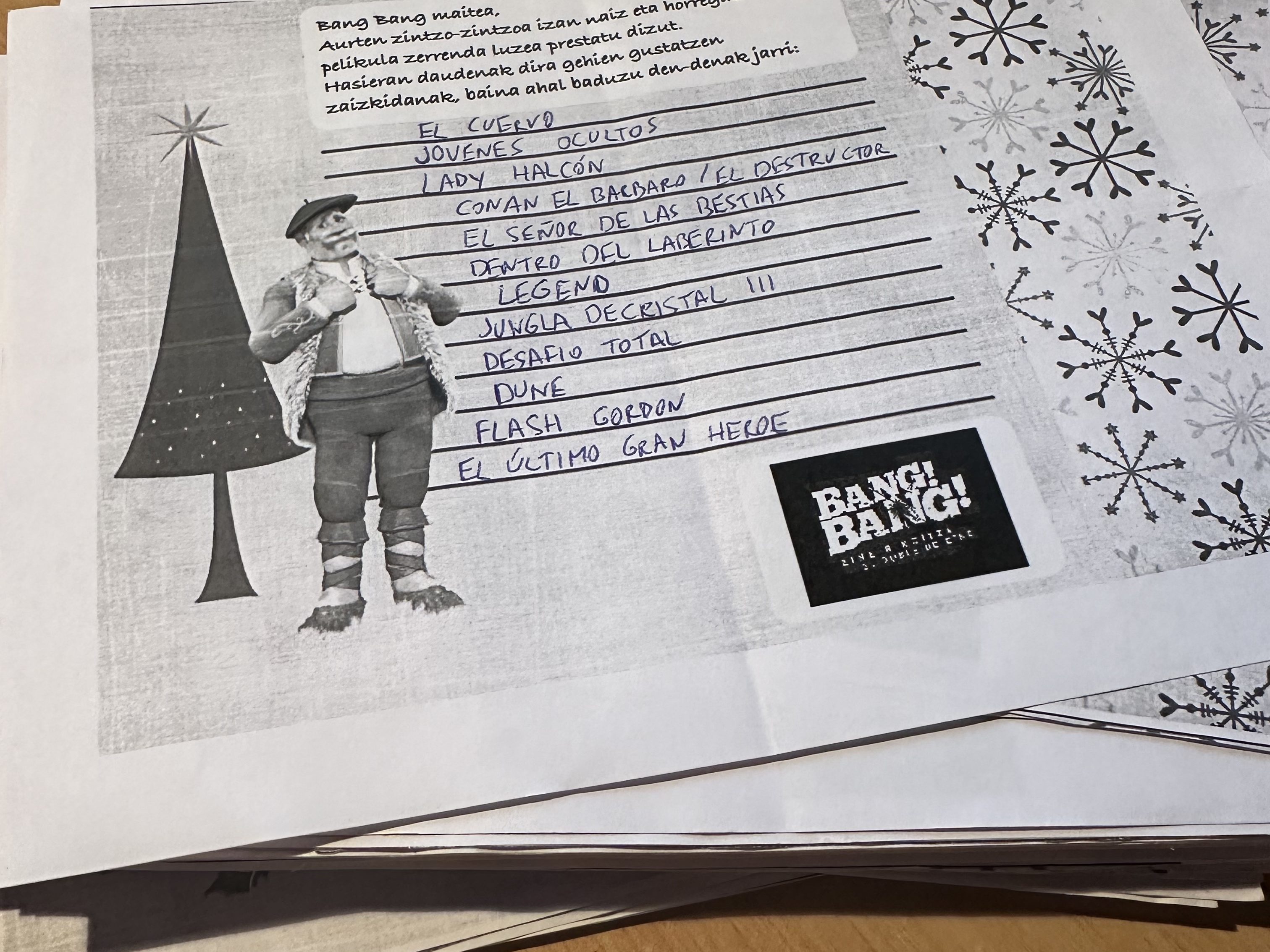 Para ello decidimos empezar animando la cola con una carta al Olentzero en la que cada uno pudiera poner sus pelis más deseadas. Si normalmente hablar de pelis más deseadas es recurrente en los corrillos que se forman, esta vez lo fue aún más.