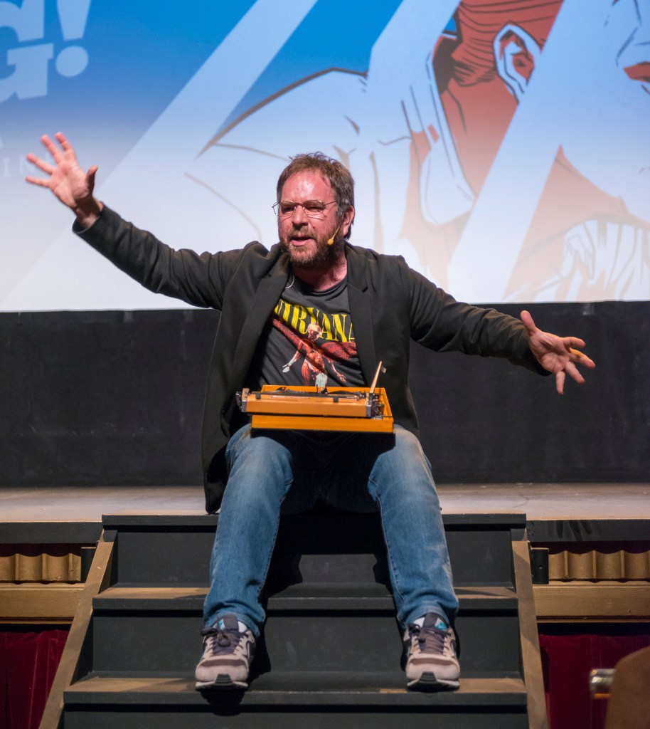 Para la presentación recuperamos a un viejo conocido que nos había acompañado en la mítica sesión de El Exorcista y en la sesión tolosarra de Por un puñado de dólares, Ion «Txiki». Si en la primera se metió al público en el bolsillo con su peculiar interpretación de Damien Karras y en la segunda con su versión local de Clint Eastwood, esta ver Stephen King fue el homenajeado. Y no solo brilló con un show divertidísimo, sino que de regalo obsequió al público con un BRUTAL monólogo de cinco minutos que hizo que todos nos partiéramos de la risa.