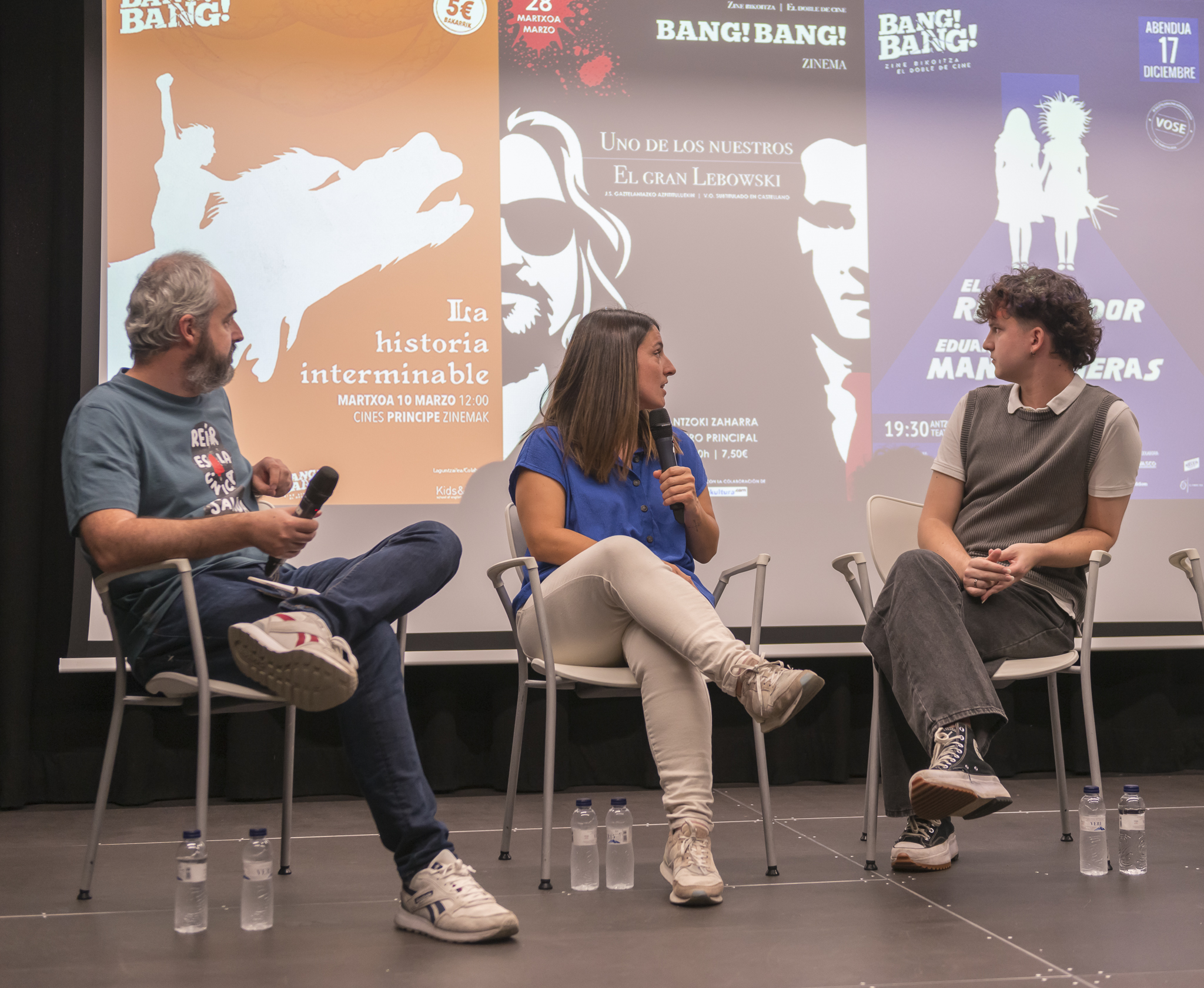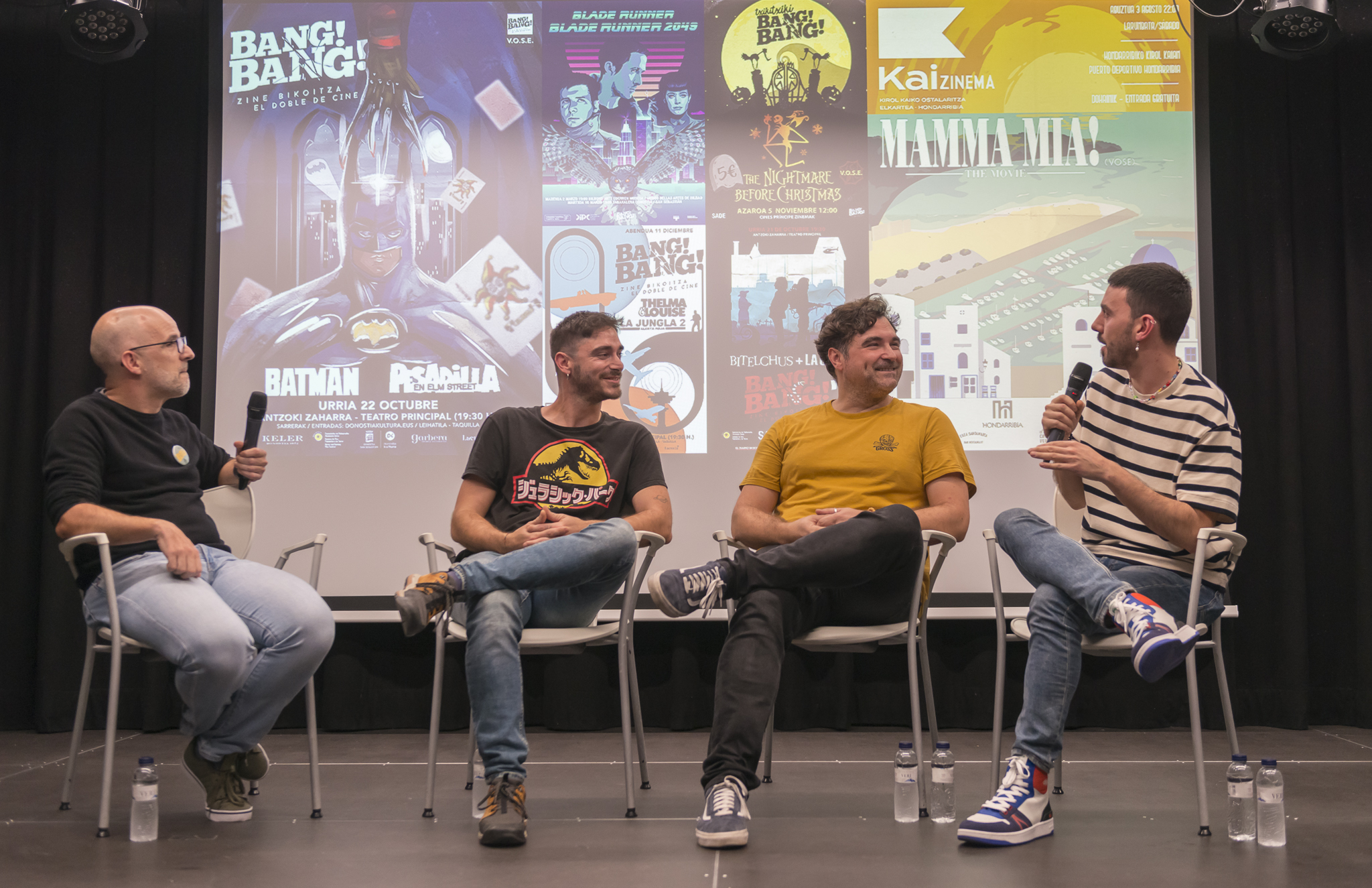 En el primer bloque que pisó el escenario contamos con Unai Baquero, el mas joven de todos nuestros cartelistas que estuvo acompañado por Maialen Fernández creadora de postres tan icónicos como el de El resplandor + Eduardo manostijeras. Ambos hablaron de su experiencia y de la gran diferencia entre hacer una cartel para una única película (sesiones especiales y txiki-txiki) o nuestro formato más clásico: la doble sesión.